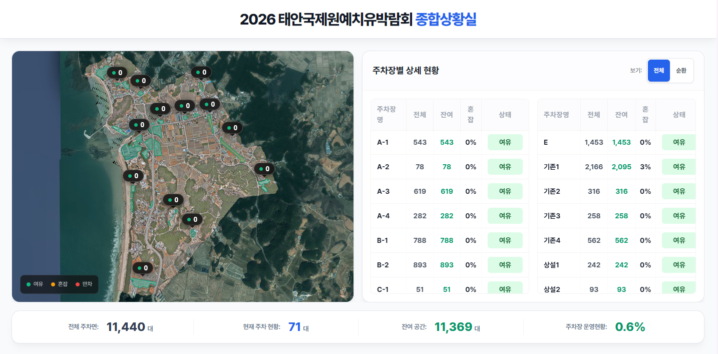 태안국제원예치유박람회의 주차 현황을 한눈에 확인하실 수 있습니다. 총 11,000대를 수용할 수 있는 넉넉한 주차 공간으로, 보다 편안하고 여유롭게 박람회를 즐겨보세요.